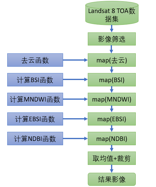 下面以去云后计算裸土指数BSI、改进的归一化差异水体指数MNDWI、增强型的裸土指数EBSI、建筑用地指数NDBI等4个指数的计算为例,来说明如何在代码级别进行优化来减少计算量从而提高计算效率。